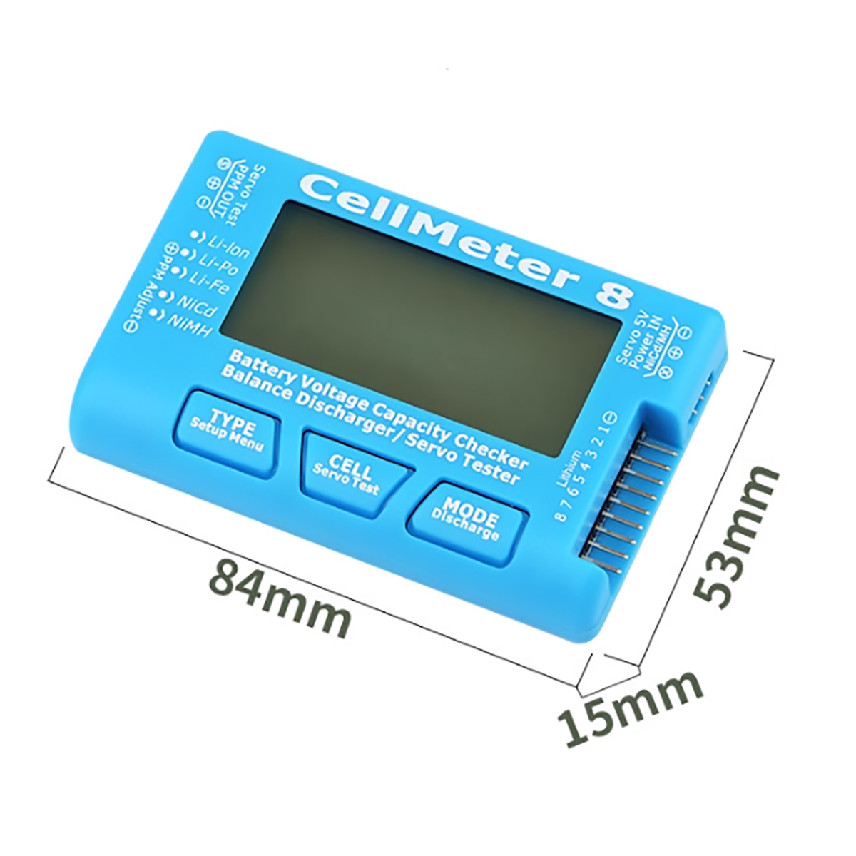 Этот тестер оснащен портом для балансировочного разъема для 8 элементов Li-PO, Li-Fe или Li-ion батарей, а также портом для разрядки Ni-MH/Ni-CD аккумуляторов. С его размерами 84х53х15 мм он легко помещается в карман или сумку, делая его идеальным компаньоном для использования как в домашних условиях, так и в поездках.